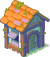 The house, where Farmer Brown and his family live, is a rectangular building with only one window (located on the roof) and an exterior entrance in the center. Like most buildings in the village, it features an orange roof and a propeller on the side. Crates can be seen against the side of the house. The interior of the building is without walls. There are three beds inside, two of which are next to each other. There is a dining table with three chairs, a chest, two vases, and a bookshelf.