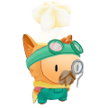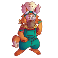 Stampy is an orange-furred Raposa and has a brown beard. He almost always wears a yellow-tinted chef's hat and has a pair of teal goggles on his head. He wears a yellow scarf around his neck, and his clothes consist of a pair of teal overalls and a red undershirt. He also has a grey monocle over his left eye.