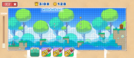 In Build Mode, the player is given a Bounce and three Megaminis. One possible solution is for the player to put a Megamini on each of the first two floating platforms, place the Bounce on the third, and the final Megamini on the fourth.