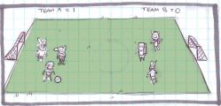 Rapo-Kick is the Raposa world equivalent of soccer. The goal of the game is to get the ball into the opposite color goal, red into blue and blue into red. There are four players on the field for each team, three fielders and a goalie. At the beginning of each set, the ball is dropped onto the Red Team Logo.