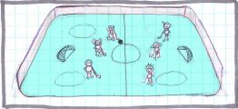 Rapo-Puck is the Raposa world equivalent of hockey. The goal of the game is to shoot the puck into the opposite color goal, red into blue and blue into red. There are four players on the field for each team, three fielders and a goalie. At the beginning of each set, the puck is dropped onto the Red Team Logo.