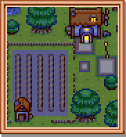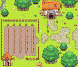 Outside the house, there is a basic, fenced farming field with five rows of soil. Each row of the field can hold four Banya stalks. This means that the farm can have up to twenty Banya Stalks. The Hero is limited to placing just five, which would only fill one row and leave one stalk standing alone in a different row. Connected to the bottom section of the farm is a stockroom. Its actual purpose is unknown as it is never seen utilized.