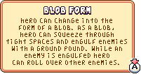 Exclusive to Drawn to Life: The Next Chapter is Blob Form, a transformation where the Hero turns into a spherical blob that can engulf enemies. The preset drawing for this creation is a green sphere with small bumps. This mode is slightly transparent and is not rigid, but can become rigid when holding an enemy inside it.